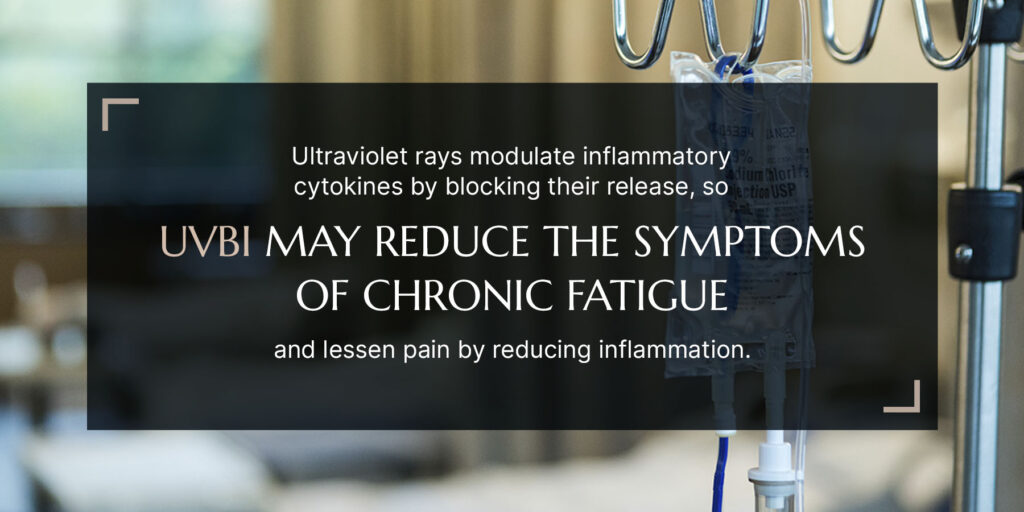 There is a strong link between high levels of inflammation and chronic pain and fatigue. Ultraviolet rays modulate inflammatory cytokines by blocking their release, so UVBI may reduce the symptoms of chronic fatigue and lessen pain by reducing inflammation. This is especially interesting for people with debilitating conditions such as: