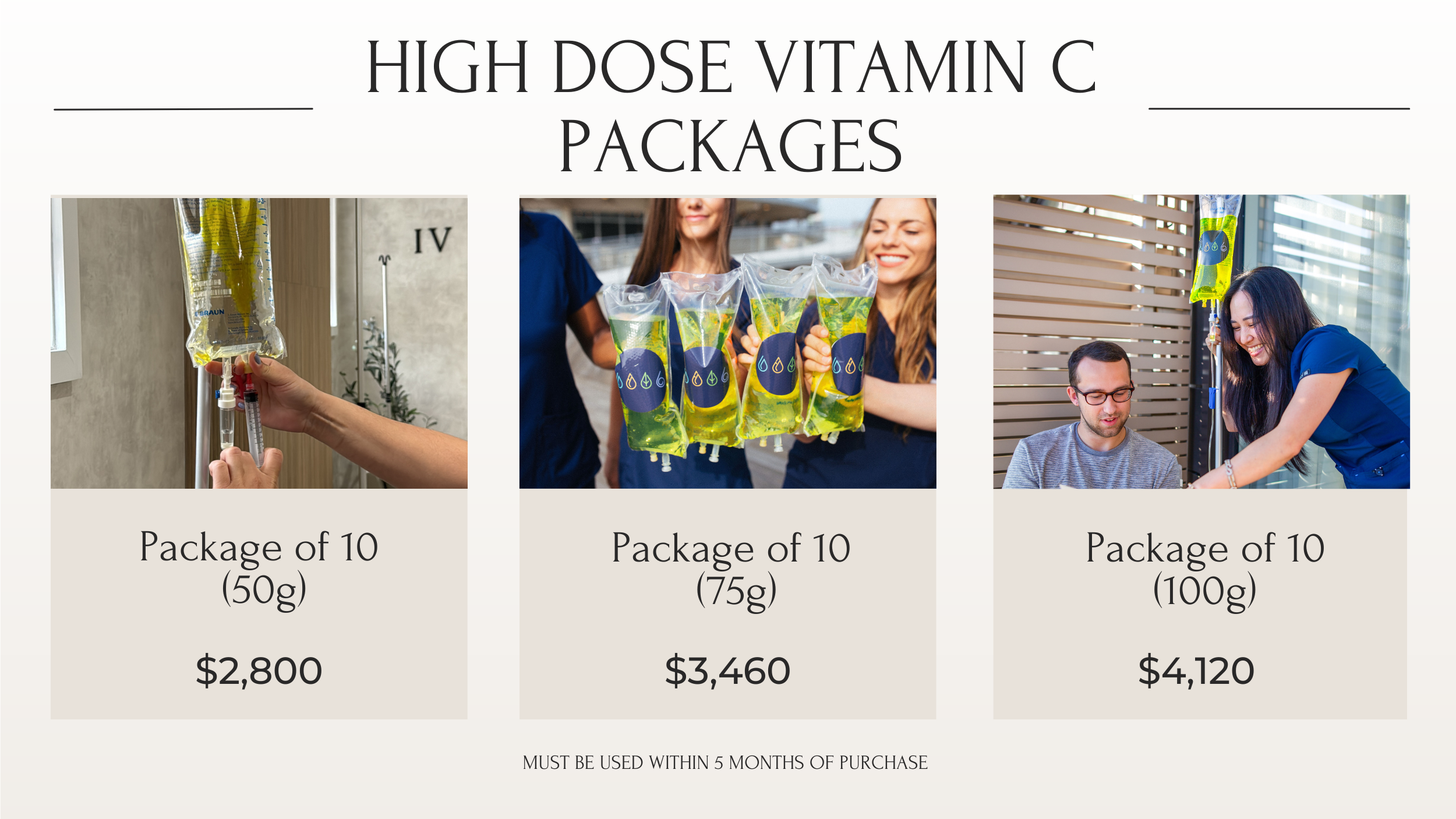 • 3rd infusion: client dependent, 75 grams, where after 3 weeks of infusions 2-3x week, we check Vitamin C peak and trough levels.